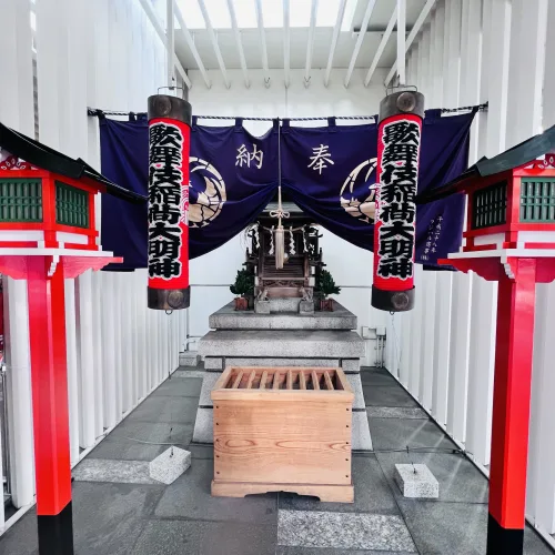歌舞伎興行の大入りや安全、お客様や舞台関係者の平穏無事、また、近隣の平安、火伏の守護などを祈願して祀られています。 晴海通りに面しており、観劇以外の方もお参りすることができます。 毎年二月午日は「初午祭」を開催。歌舞伎興行の初日と千穐楽には「奉告祭」が執り行われています。