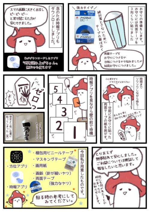 壁に直接貼れない場合は、画用紙などを壁に固定してその上から御守りを貼るのはOK