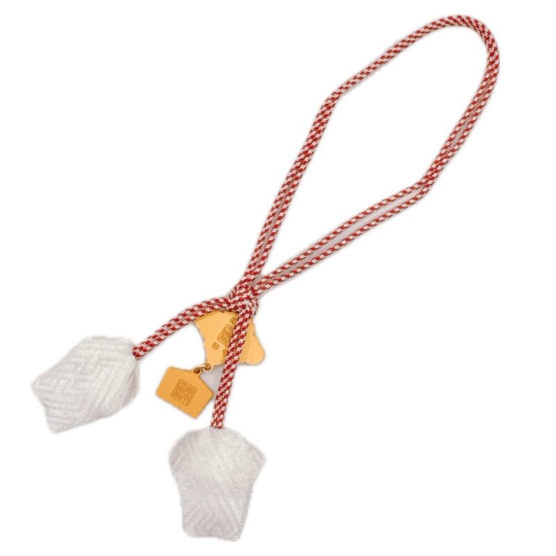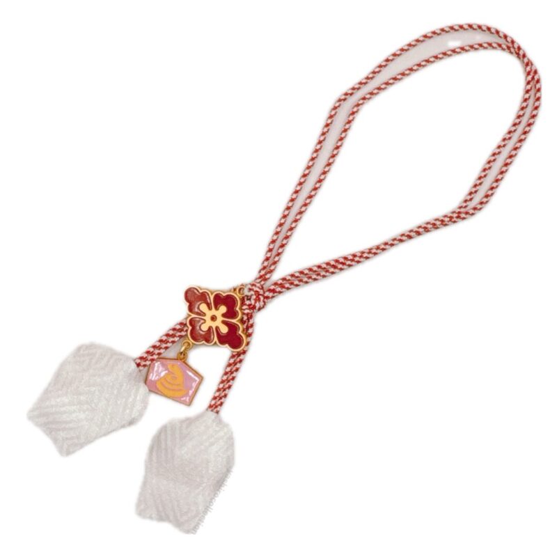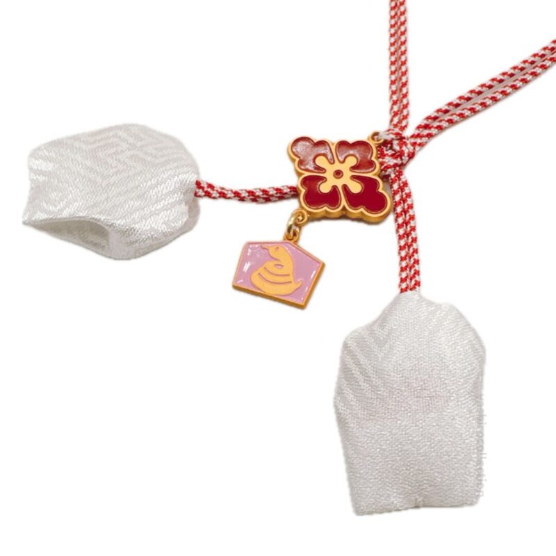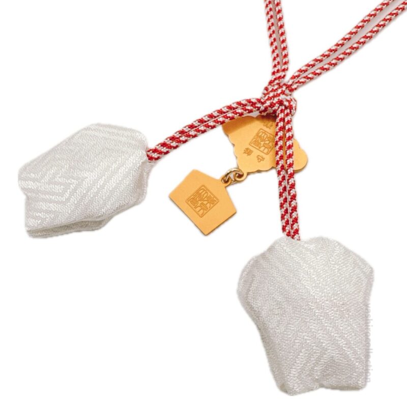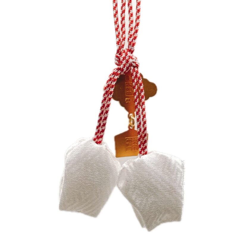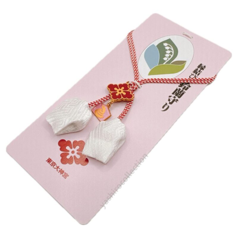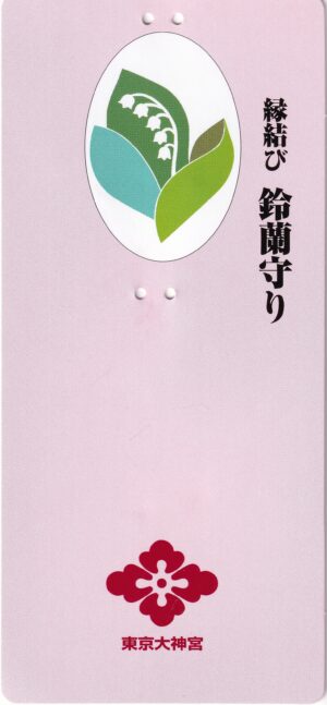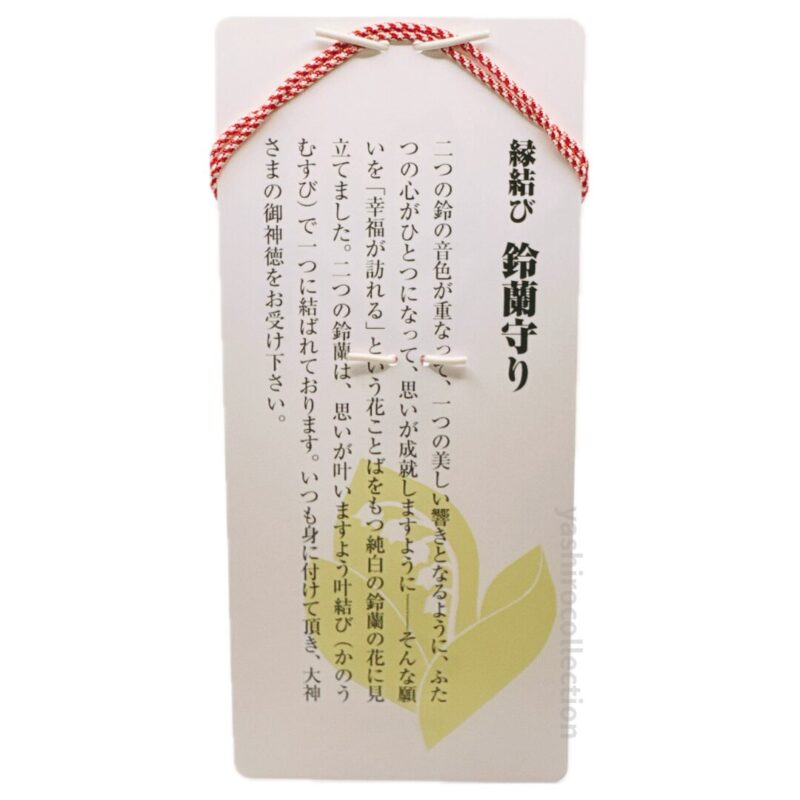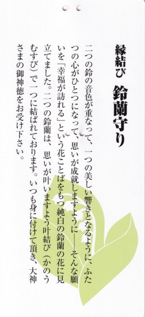 二つの鈴の音色が重なって、一つの美しい響きとなるように、ふたつの心がひとつになって、思いが成就しますように-そんな願いを「幸福が訪れる」という花ことばをもつ純白の鈴蘭の花に見立てました。二つの鈴蘭は、思いが叶いますよう叶結び(かのうむすび)で一つに結ばれております。いつも身に付けて頂き、大神さまの御神徳をお受け下さい。