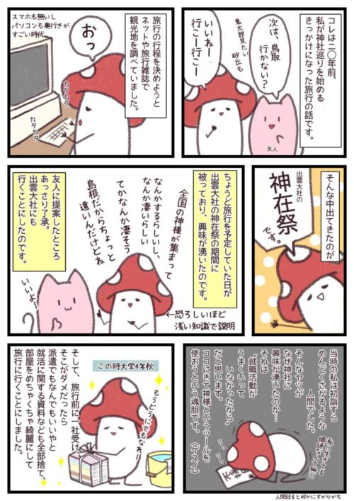 読んだら多分「何がきっかけになるかわからないものだなー」という、これから神社巡りを始める人には全く参考にならない漫画になっていますが、是非お読みください。