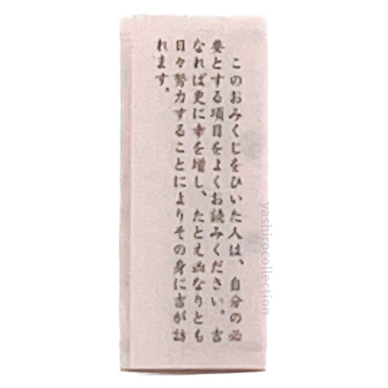 このおみくじをひいた人は、自分の必要とする項目をよくお読みください。吉なれば更に幸を増し、たとえ凶なりとも日々努力することによりその身に吉が訪れます。