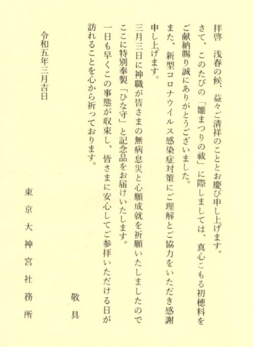 さて、このたびの「雄まつりの祓」に際しましては、真心こもる初穂料をご献納賜り誠にありがとうございました。