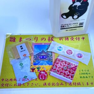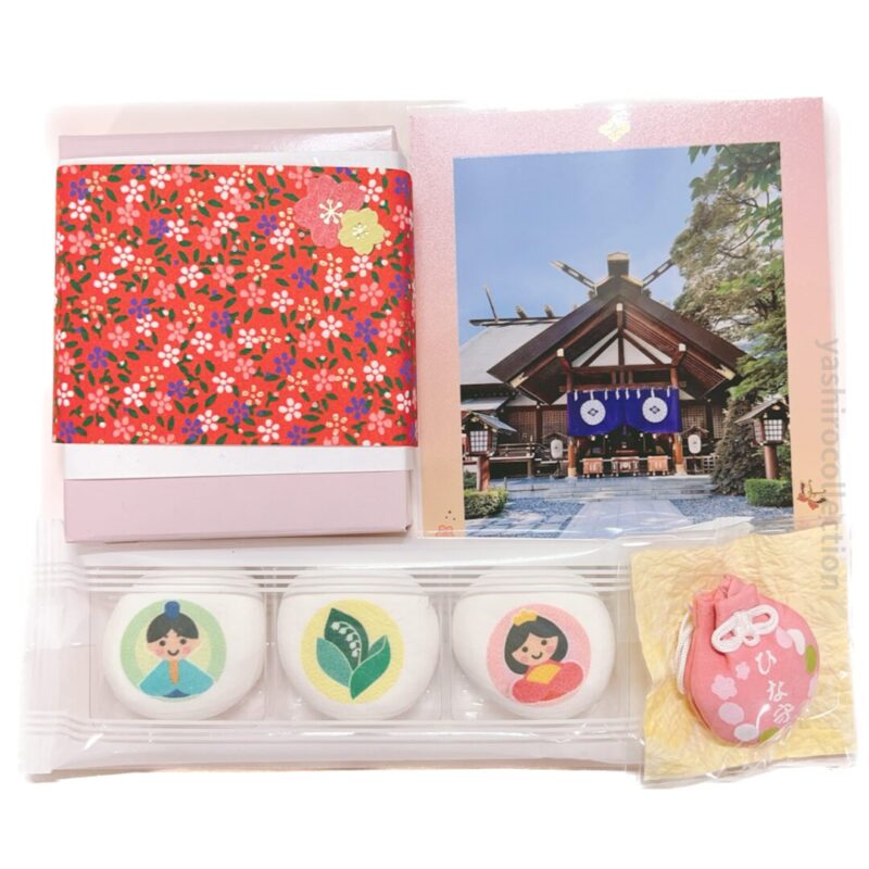 祈願祭の記念品の内容はひな守・マシュマロ・飴・ポストカードのセットでした。初穂料によって記念品の内容が異なります。こちらで紹介しているのは2000円のものです。(初穂料は2000円・3000円・5000円から選びます)