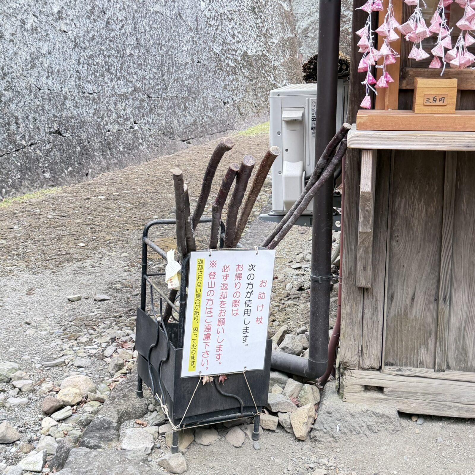 杖になる木の貸し出しや、本殿に向かうのは階段だけではなく坂道もありますのでうまく利用してください。(坂道は登っていないので辛いかの比較はできませんがそこまで緩やかではなかったです。)