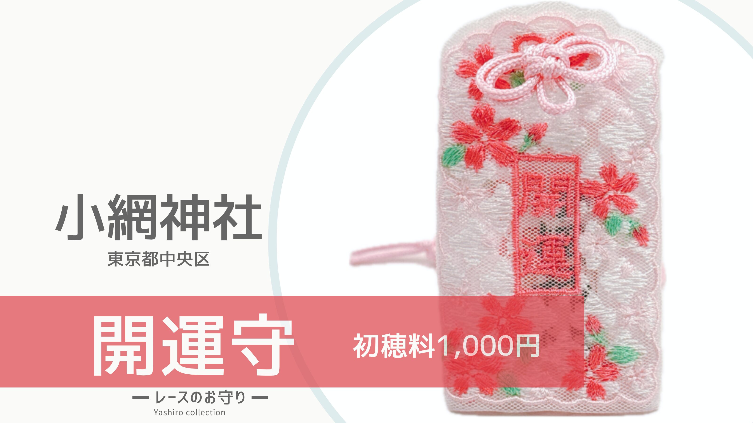 小網神社(東京都中央区)で授与されている「開運守」を紹介します。 レースと刺繍がとてもかわいく、実際にいただいたお守りを写真つきでまとめました。