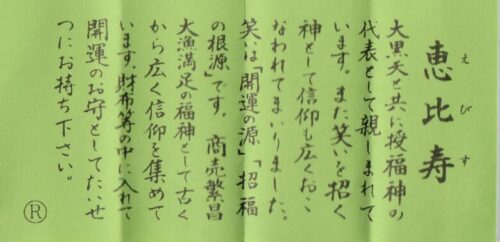 笑いは「開運の源」「招福の根源」です。商売繁昌大漁満足の福神として古くから広く信仰を集めています。財布等の中に入れて開運のお守としてたいせつにお持ち下さい。