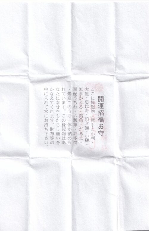 ここに縁起物(熊手と小判・大黒・恵比寿・招き猫・小槌・無事かえる・銭亀・だるま・軍配うちわ・六瓢箪・お多福・鷽鳥)のうち一体が納められています。この縁起物はあなたに幸せをもたらし願いをかなえてくれます。財布等の中に入れて常にお持ち下さい。