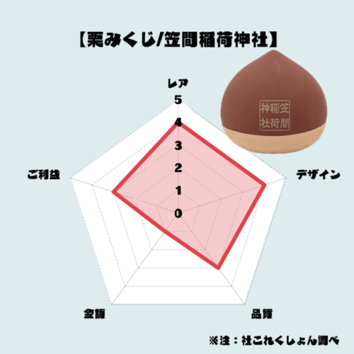 基本情報 縁守初穂料:500円笠間稲荷神社茨城県 笠間市サイズ:お守り)0.9cm×0.3㎝×1.5㎝×全長10.0㎝台紙)5.0cm×12.6㎝授与日:2025/12/28 写真 勝手にレーダーチャート…