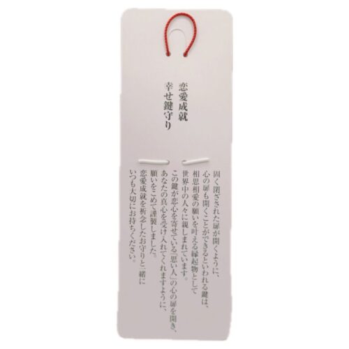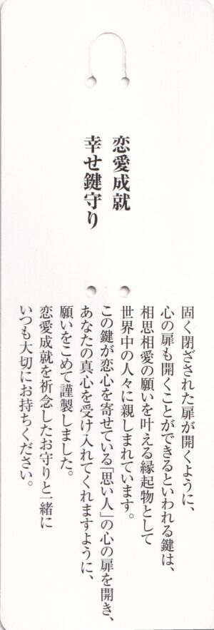 恋心を寄せる「思い人」の心の扉を開き、真心を受け入れてもらえますよう、相思相愛の願いを叶える縁起物の鍵をモチーフにしたお守りです。恋愛成就を祈念したお守りと一緒にお持ちください。