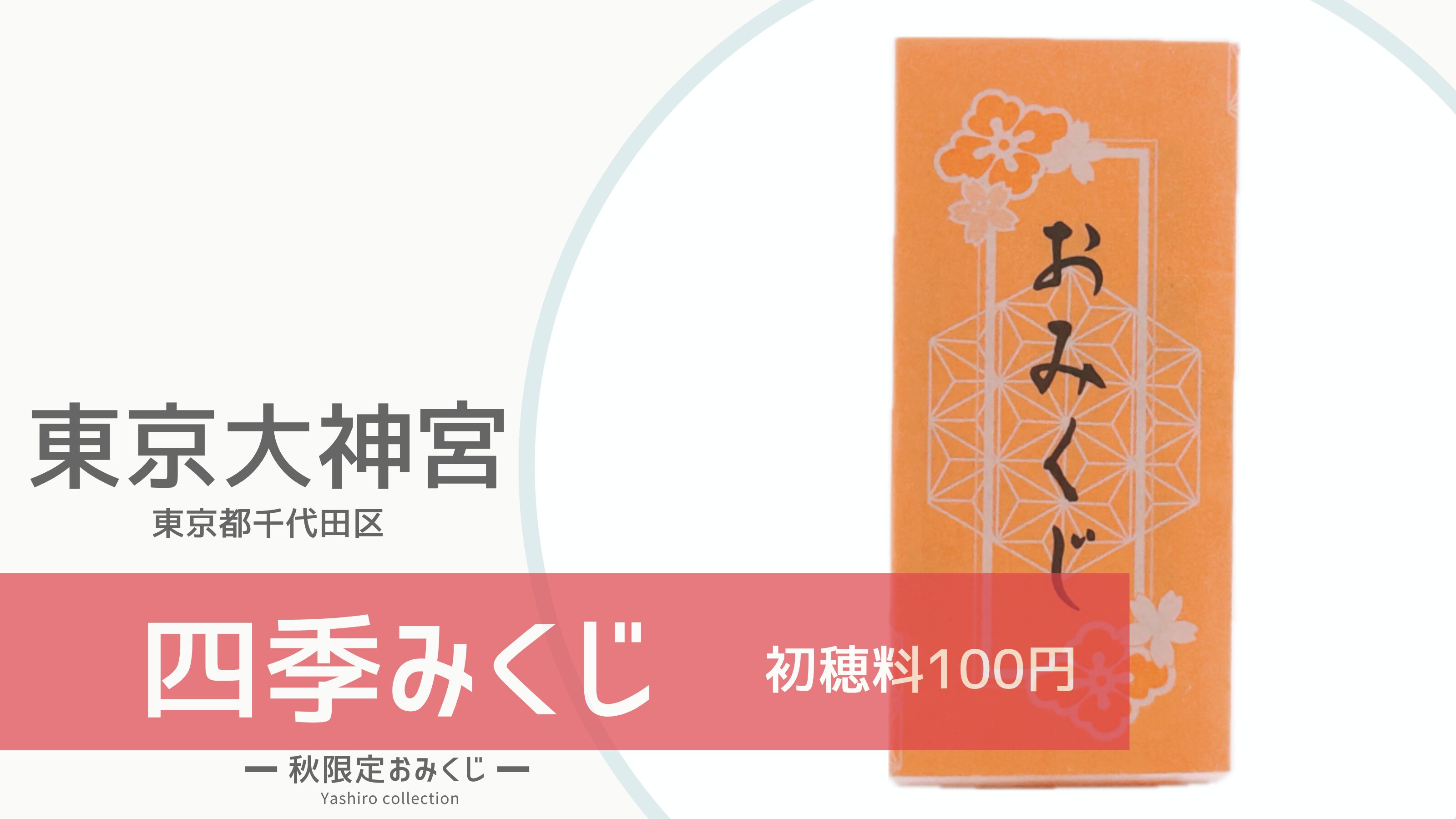 東京大神宮(東京・千代田区)で授与されている「四季みくじ(秋)」を紹介します。 季節で色がかわるシンプルなおみくじ、実際にいただいたお守りを写真つきでまとめました。