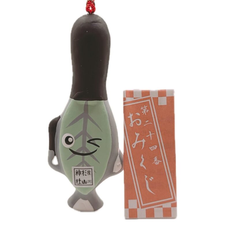 ■星川杉山神社のオリジナルキャラクタースギマロの人形が付いたおみくじ。