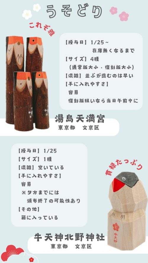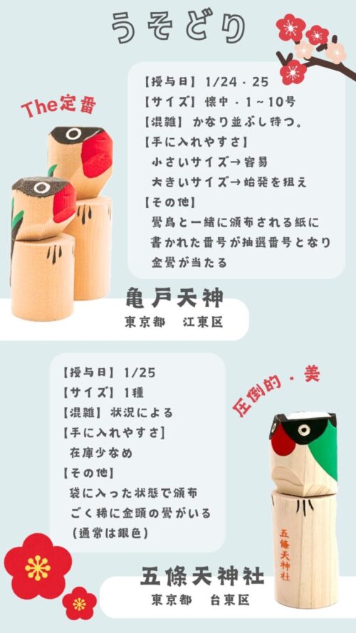 ・東京の神社では1月25日の初天神の日に行い、前年にいただいたものをお返しして、新しい鷽鳥をいただくのがメジャー。