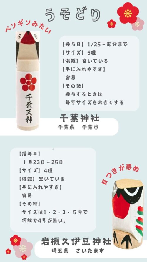 鷽鳥初穂料:1,000円千葉神社千葉県 千葉市サイズ:2.2cm×2.2㎝×9.0㎝(一番小さいサイズ)例年1月25日~2月3日まで授与サイズ5種類あり年々サイズを大きくし、一番大き…