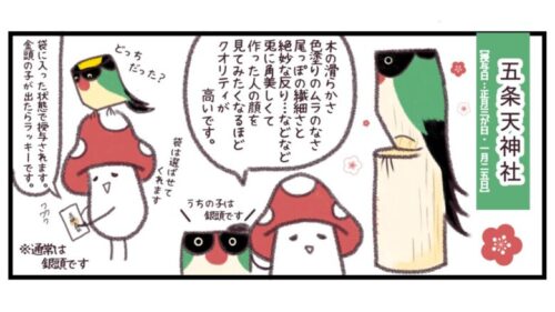 こんにちは!やしろ きのこです。亀戸天神社に引き続き、鷽替神事に行ってきました。五條天神社さんの鷽は数が少ないという噂。でもこの寒波の襲来に朝早く起きていくに…