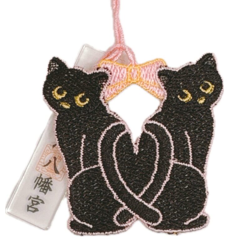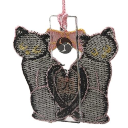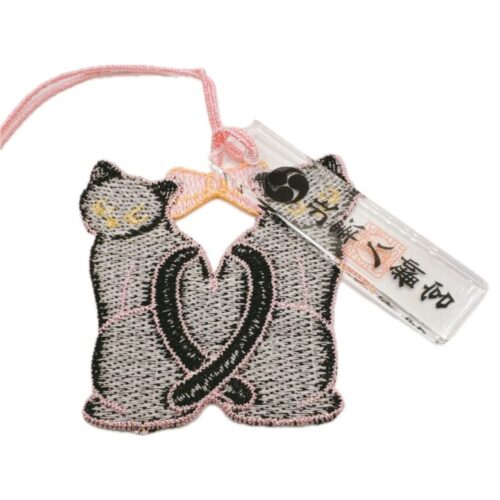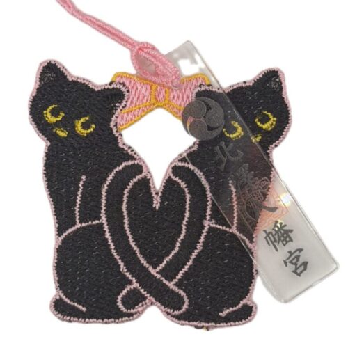 透明な御神符と、二匹の黒猫の刺繍が揺れる縁結びの御守です。