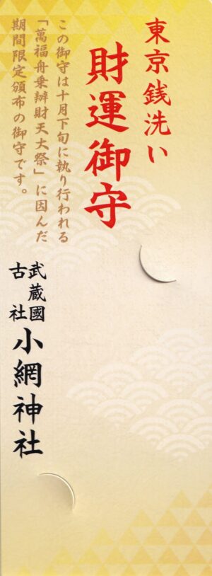 財運守初穂料:1,000円小網神社東京都 中央区令和6年弁天祭限定2024/10/19~頒布・数量限定サイズ:お守り)4.6cm×0.1㎝×7.6㎝ケース)5.3cm×8.4㎝台紙)5.7cm×14.0㎝授与…