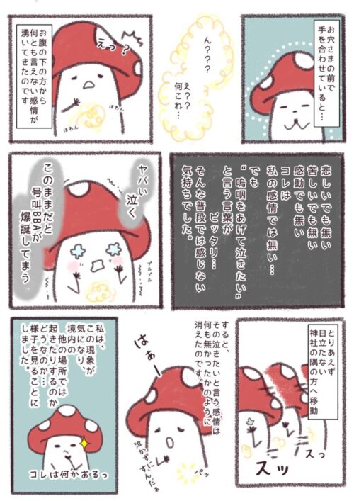 「なんだコレ?」と思っているとそのモヤモヤは体の下から徐々に上がってきて、みぞおちの辺りにきたところで泣きたいという気持ちになる…というか、わかる感覚でした。